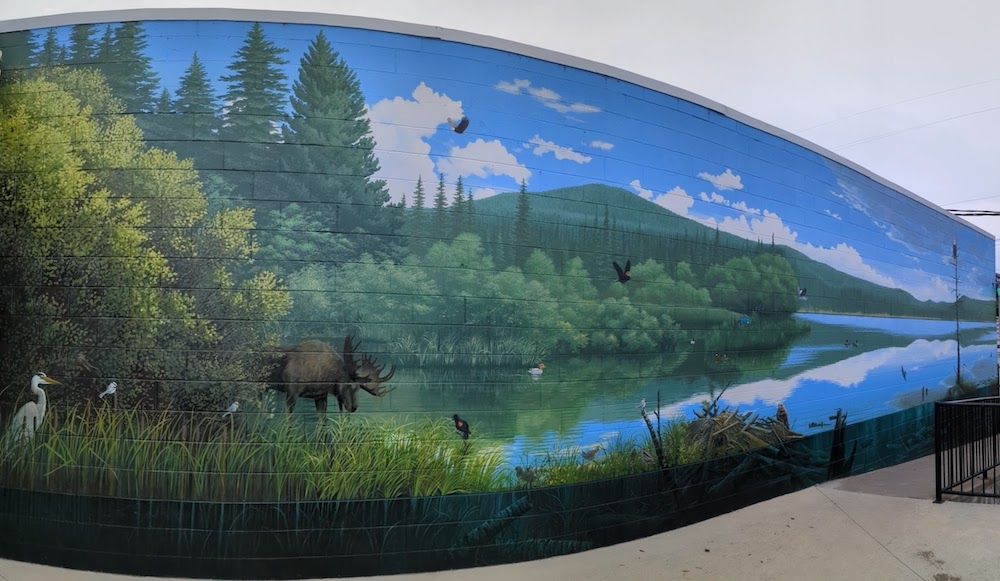 Depicting both the lake and adjoining wetland, this scene is inspired by Lost Lake in the Okanogan Highlands. This mural offers people in town an opportunity to search out and observe the diverse flora and fauna that live in and alongside the lakes and watery habitats during our brilliant Okanogan summers.